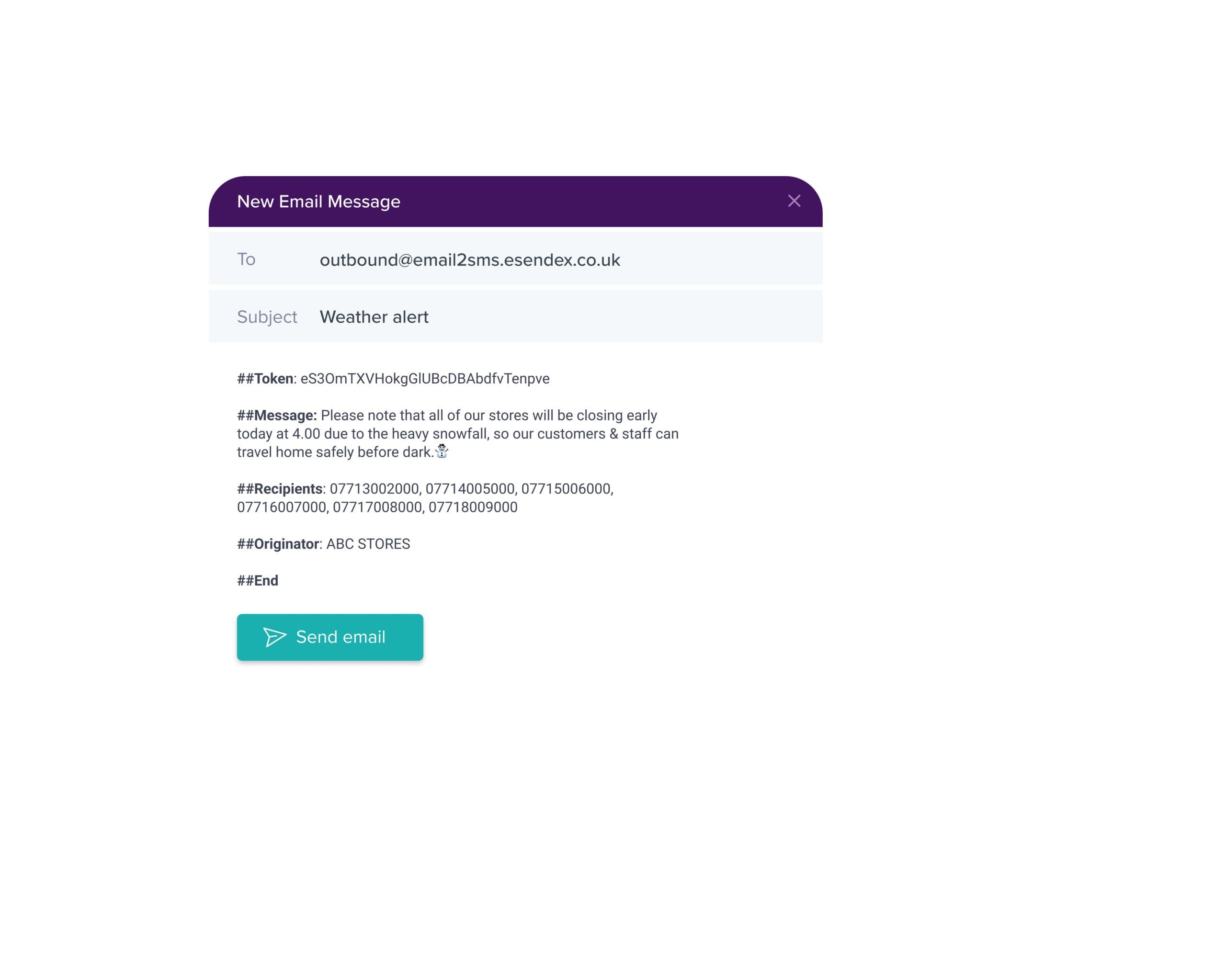 - L’identifiant/VMN de l’expéditeur par défaut défini dans Esendex peut être remplacé en saisissant une autre valeur dans la partie « ##Originator: <identifiant/VMN de l’expéditeur par défaut> » du corps du message.